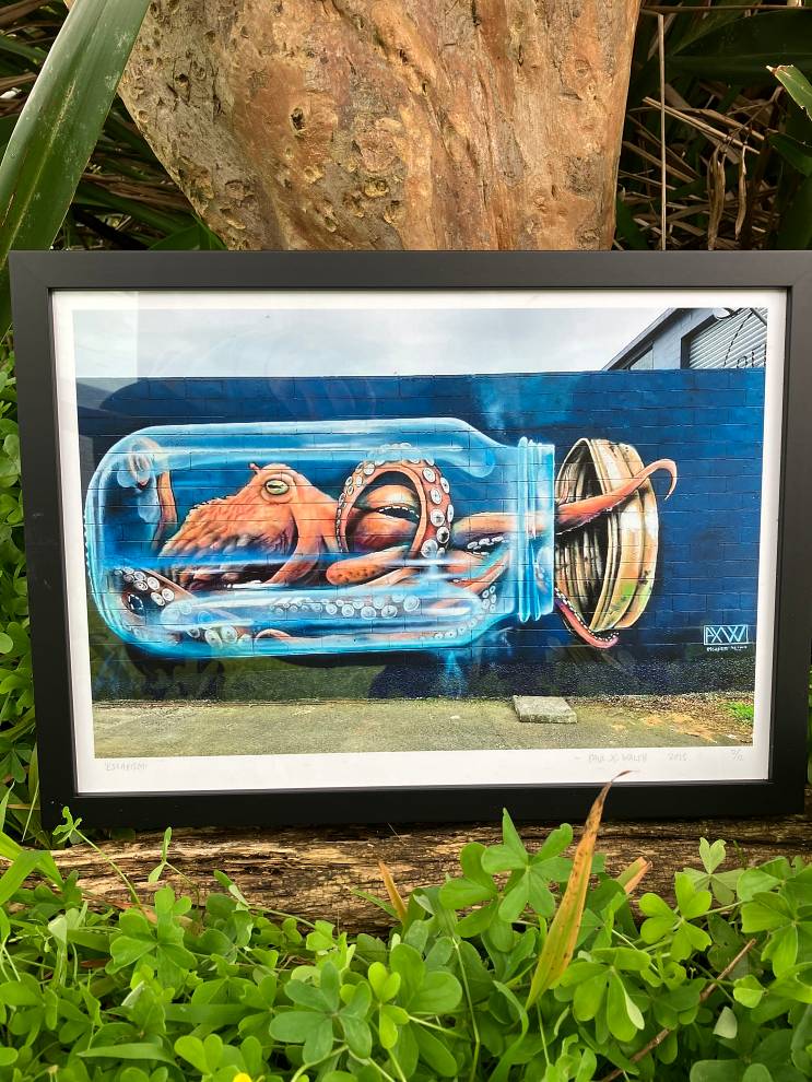 I have to be completely honest about this one, too; it was printed from a lower quality image file, thanks to my poor data management and general bad luck with technology. Maybe a better photo will turn up one day – but until then, let’s pretend this low resolution image is intentional; a testament to the temporary lifespan of street artwork, the fact it lives on in jagged jpeg’s, while the original artwork itself degrades under the weather, tags, bird crap and eternally creeping lichen. Or something 🙂